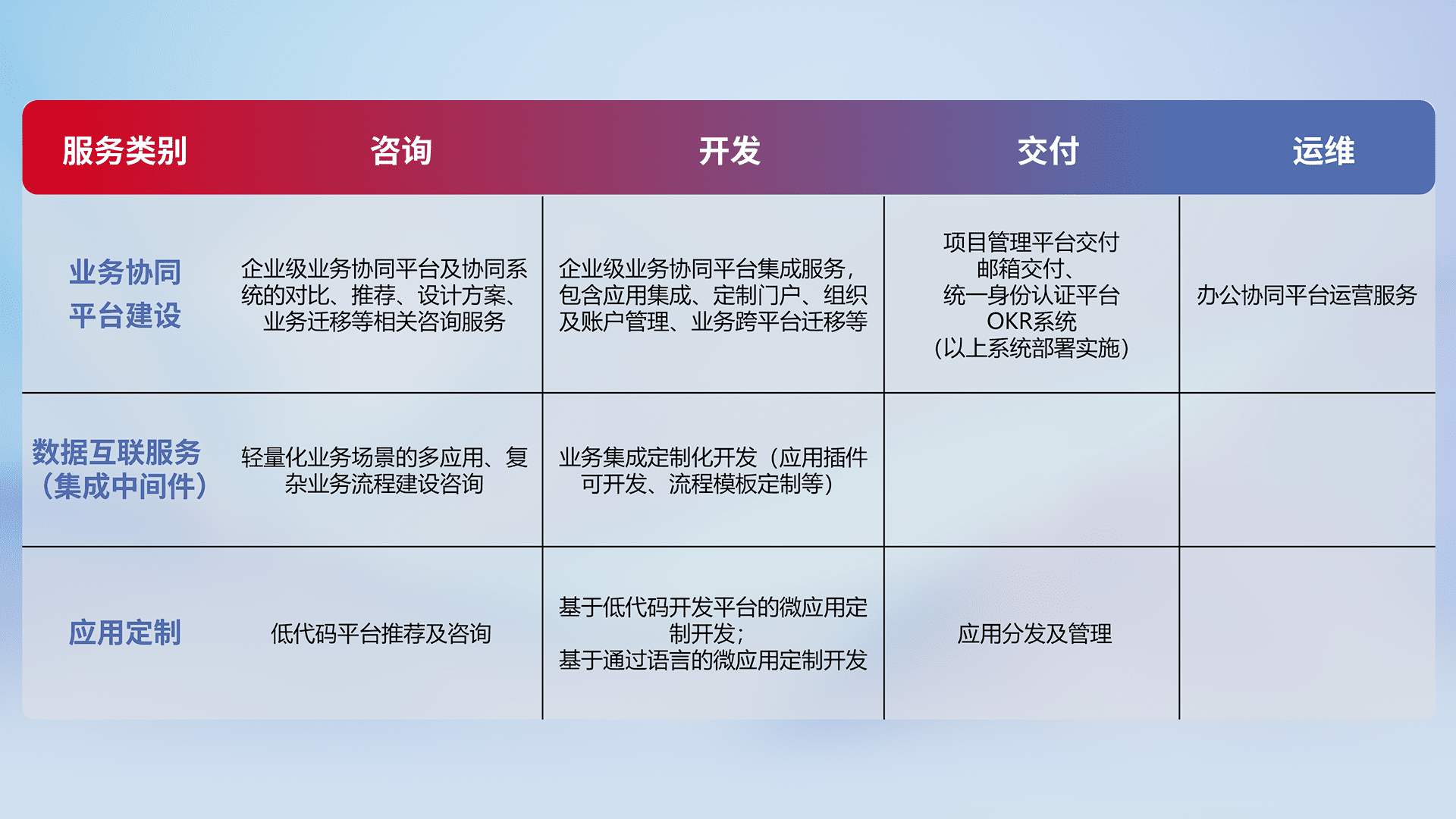 针对钉钉、、、企微、、IDaas等平台级产品提供产品的规划、、、、方案、、、、交付、、、、定制化开发等服务,,实现如统一协同办公、、、、智能客户服务、、、混合会议管理、、、智能数据查询、、、等业务场景,,,,实现数字化转型。。。