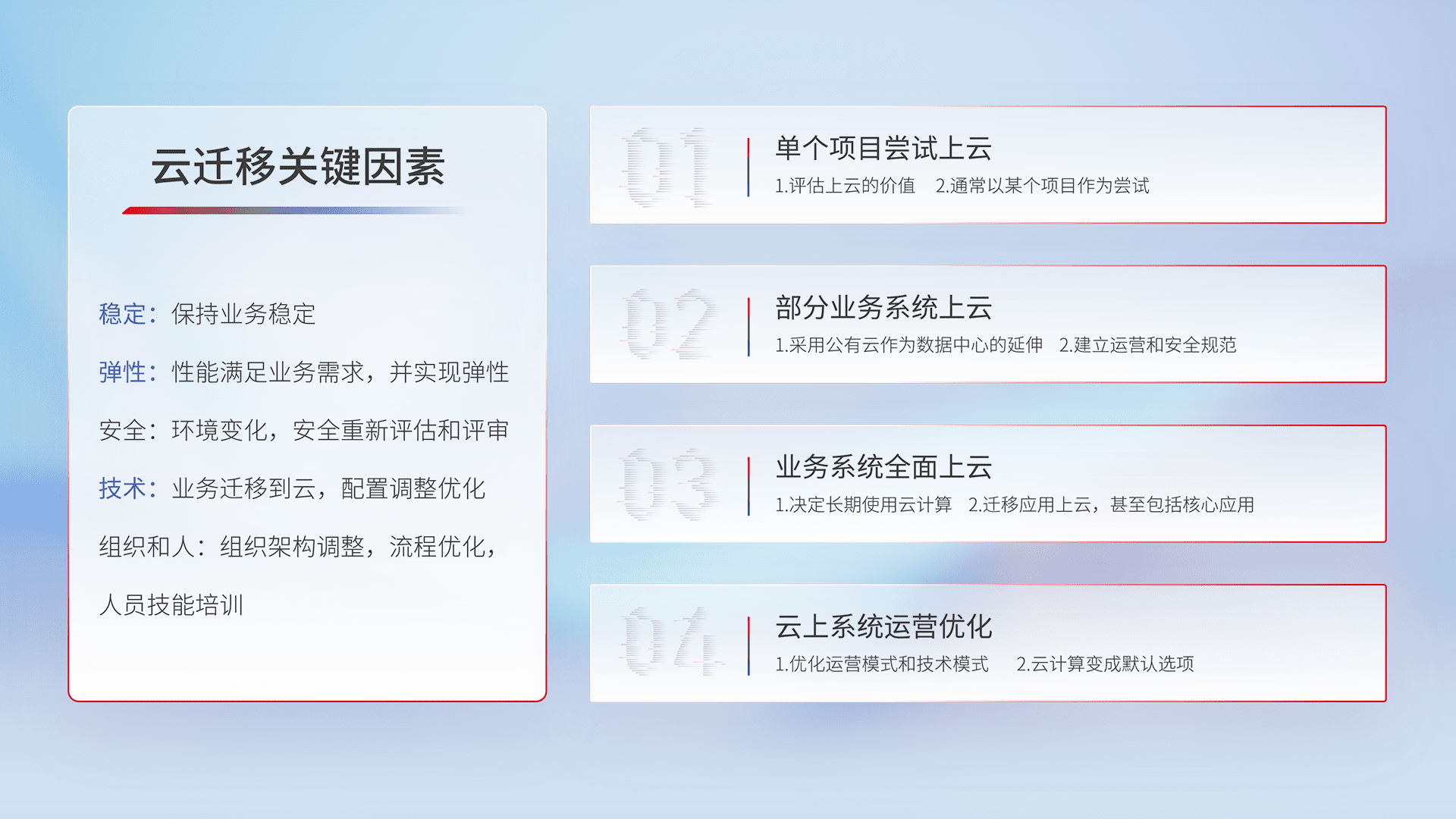 结合实际业务,,,,从规划设计、、、、云平台选型、、、、云原生改造、、、、数据迁移、、集成交付,,,迁移全过程为客户识别最佳上云路径,,,做好风险识别管理,,,设计网络架构、、、身份权限、、、安全审计合规、、、、操作审计、、日志审计、、、、监控告警策略、、、多站点容灾设计等,,对云上基础设施进行整体规划,,,,提升IT治理水平,,以满足弹性、、、高可用、、、、高性能的需求。。。