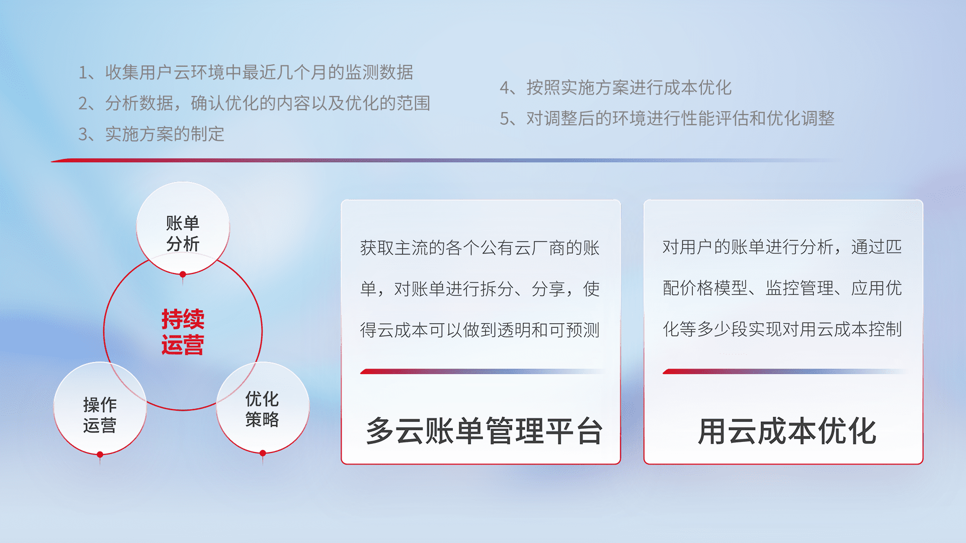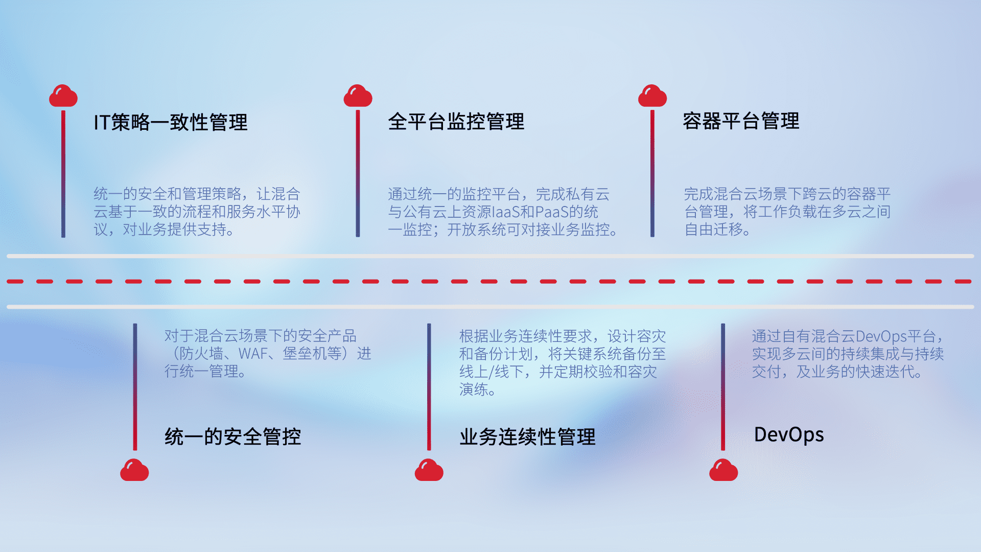 通过多云纳管,,,以统一的资源数据模型把客户的云资源进行抽象和封装,,,,进而实现对多云资源的统一操作,,,保障云资源管理的可靠性、、、稳定性与可用性。。。量身定制化运维内容,,,,配置、、、开发运维、、、补丁管理、、、、备份、、、监控、、认证和访问管理、、、审计和日常巡检等,,保障在用云过程中的可靠度,,,稳定度以及高可用率。。