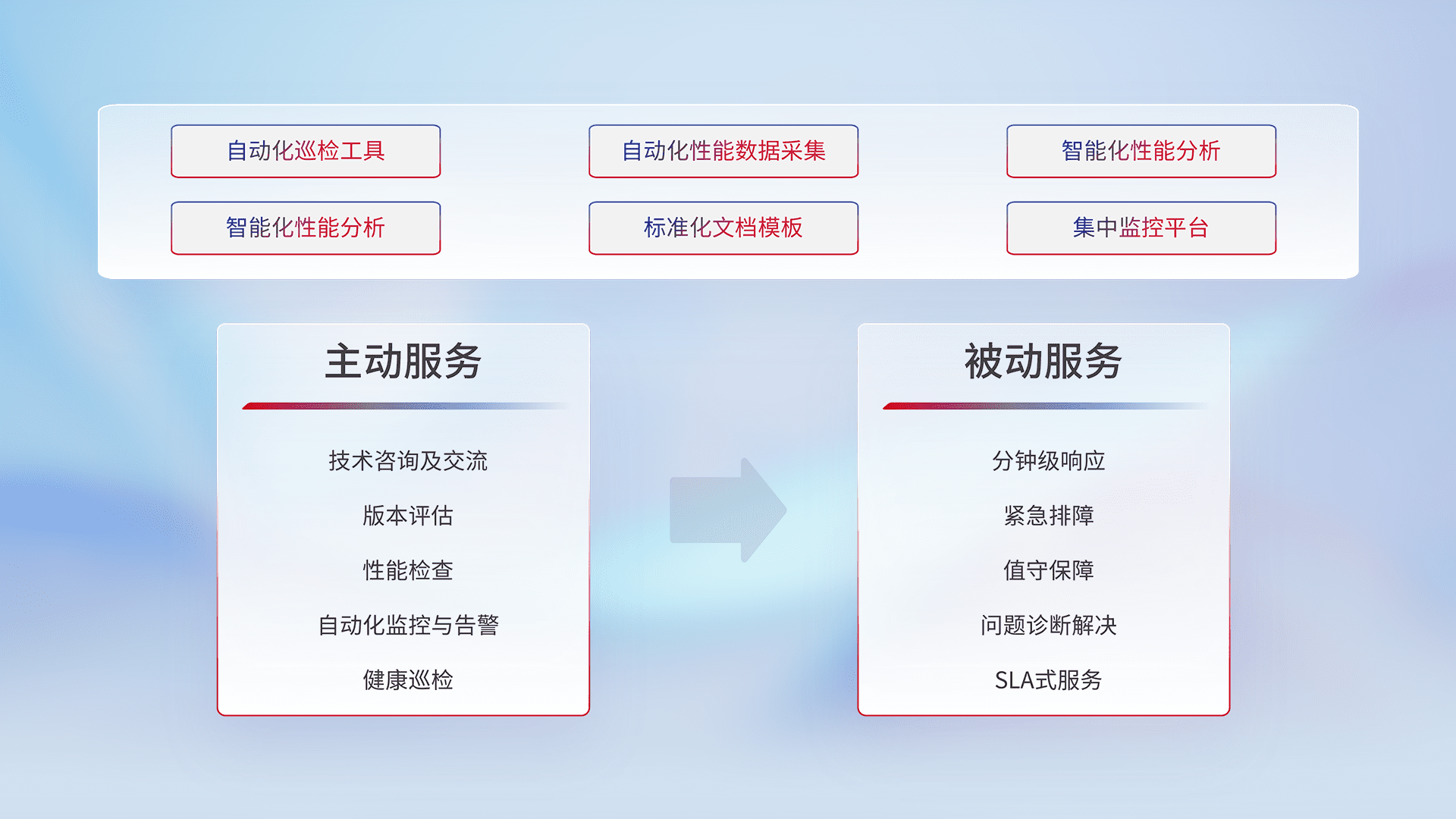 智能化工具和标准化文档,,,保障服务质量,,提供主动服务(包含技术咨询、、版本评估、、、、性能检查、、自动化监控与告警、、健康巡检)和被动服务包含(分钟级响应、、、、紧急排障、、、、值守保障、、、问题诊断解决、、、、SLA服务)。。。