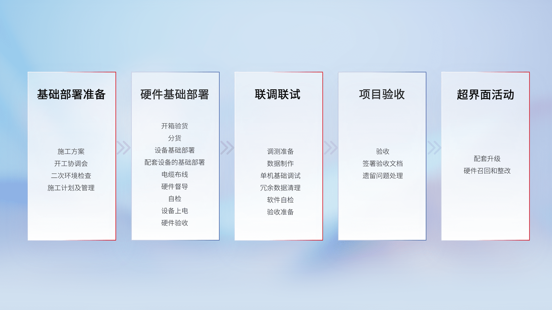 从基础部署准备、、硬件基础部署、、联调联试、、项目验收、、、、越界面活动的全过程可追溯,,,保证施工质量和进度。。。。